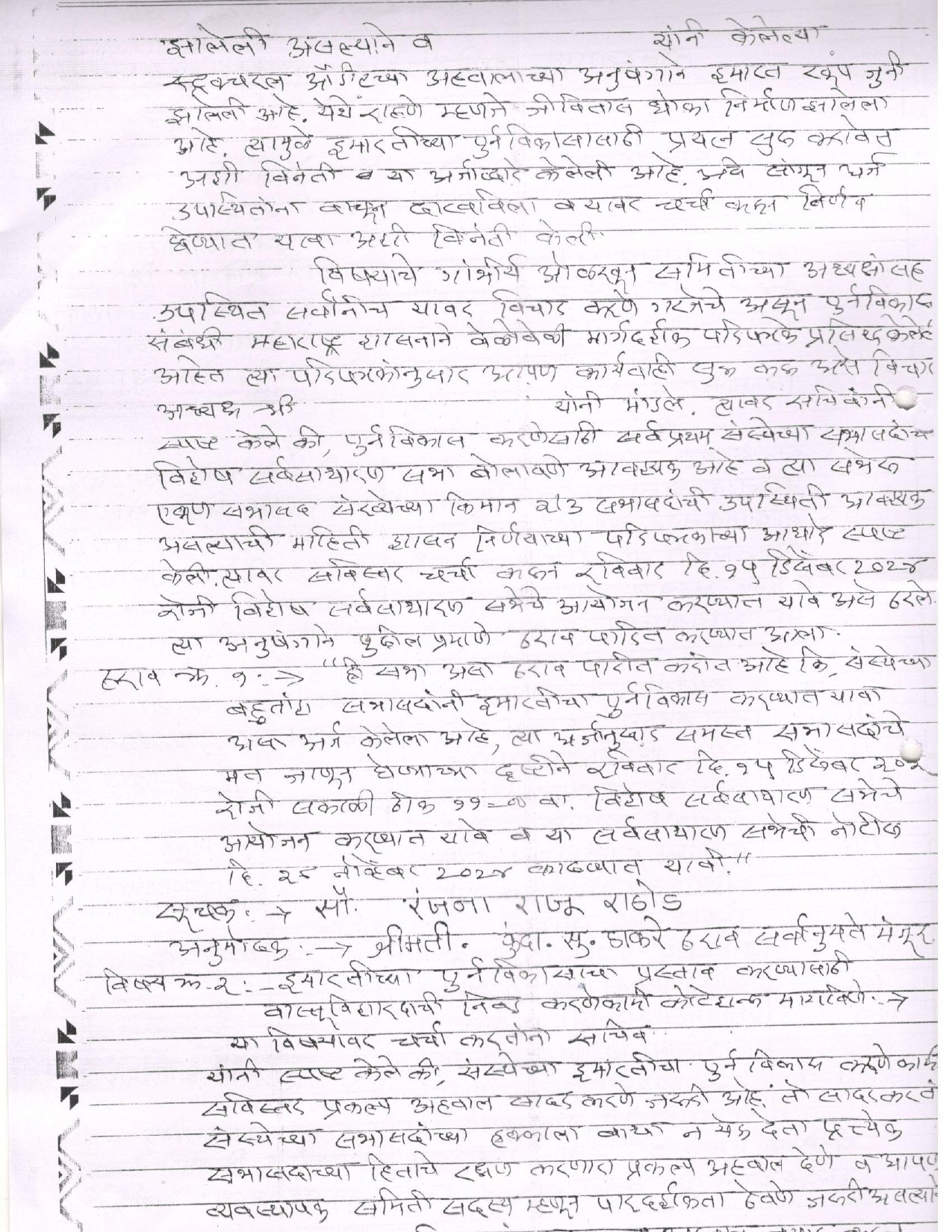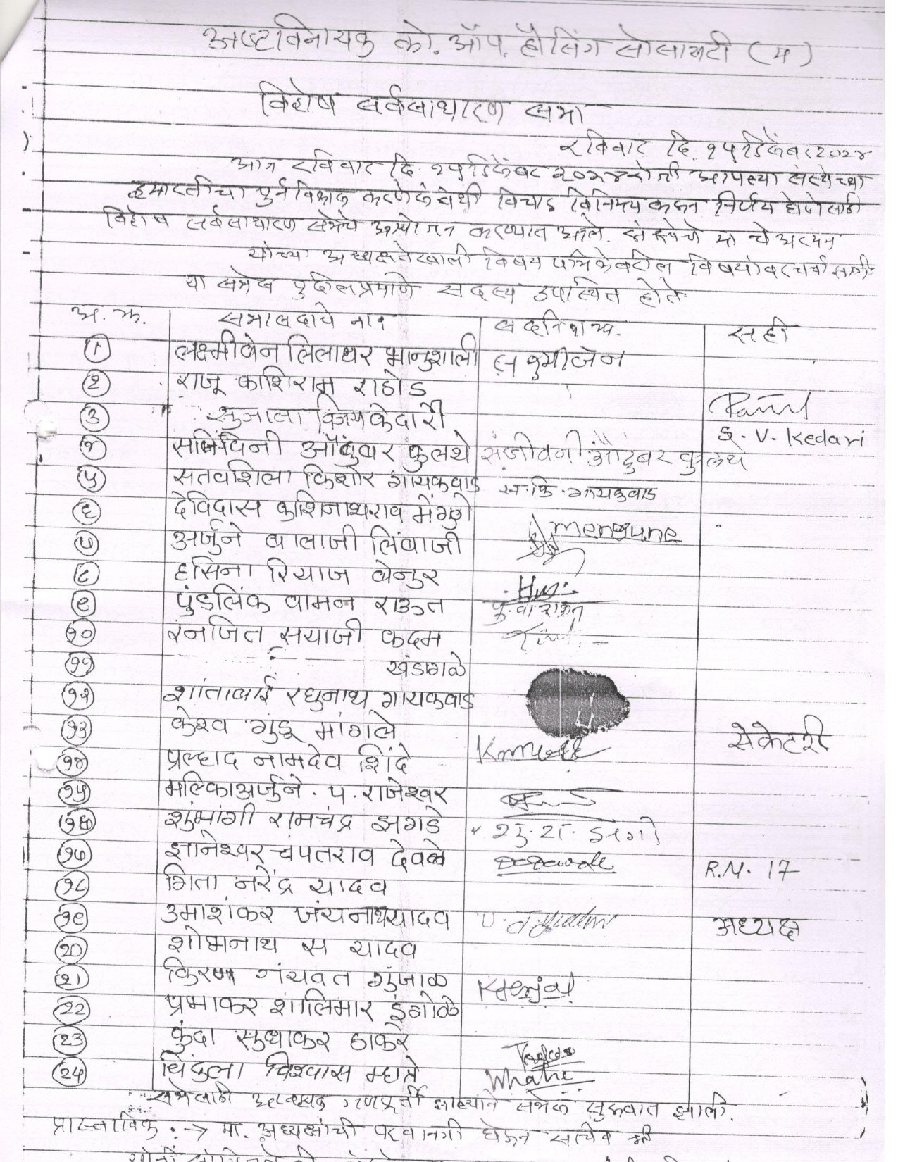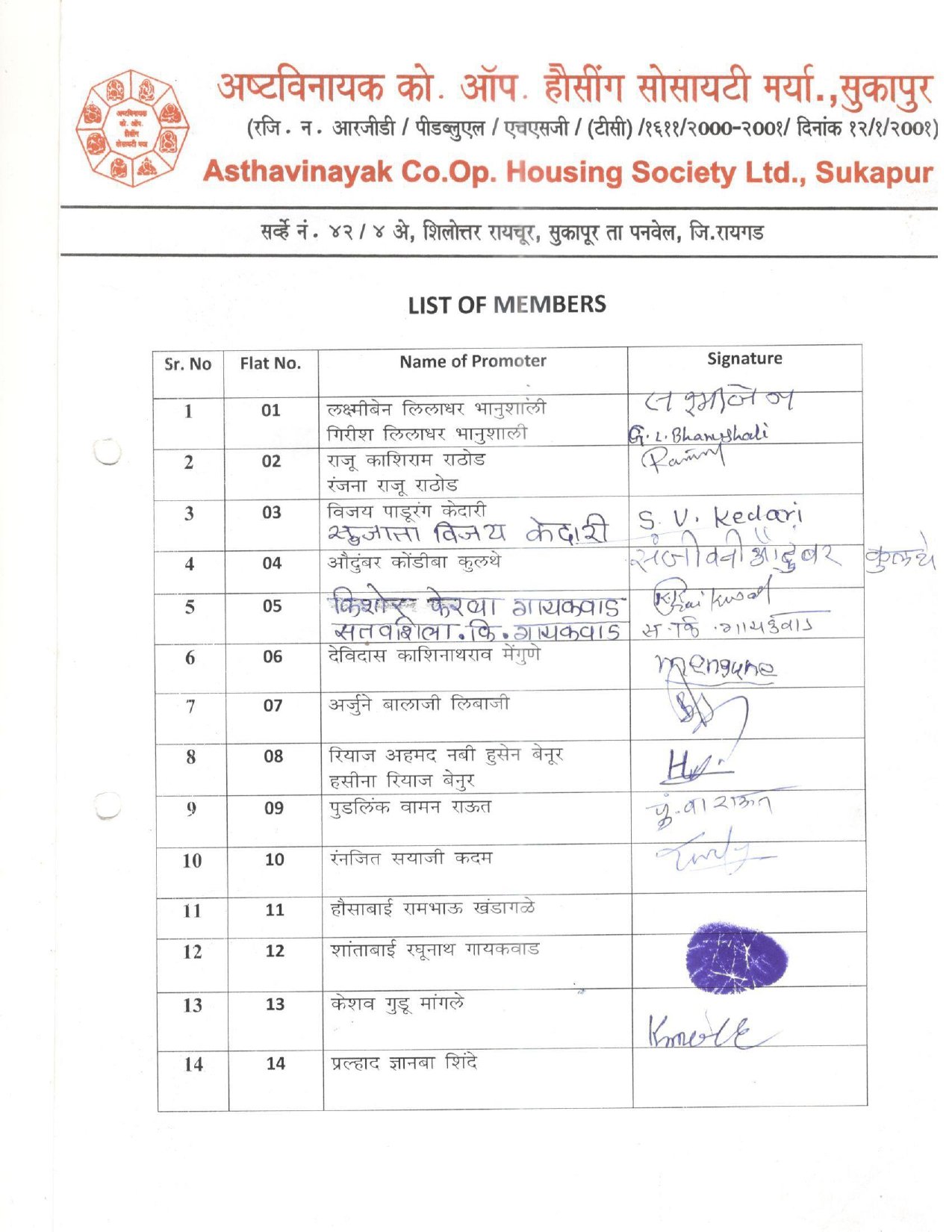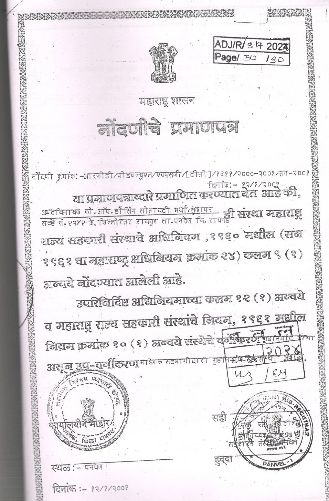 नोंदणी क्रमांक : आर जी डी / पिडब्लु एल / एच एस जी / टि सी १९९९/२०००–२००१